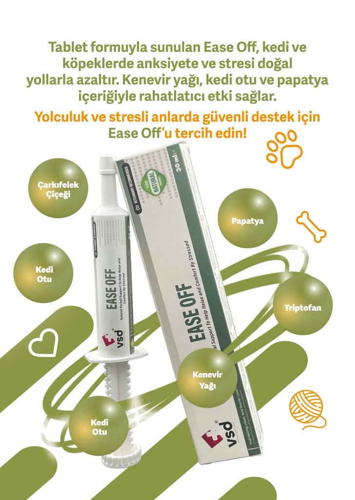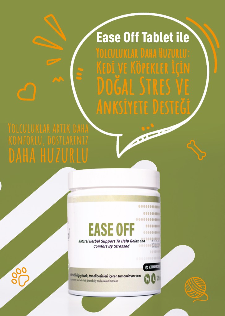 Ease Off, kedi ve köpeklerde anksiyete ve stres tedavisine yardımcı olan, yolculuklar sırasında ortaya çıkan gerginliği azaltan doğal bir tamamlayıcı yemdir.